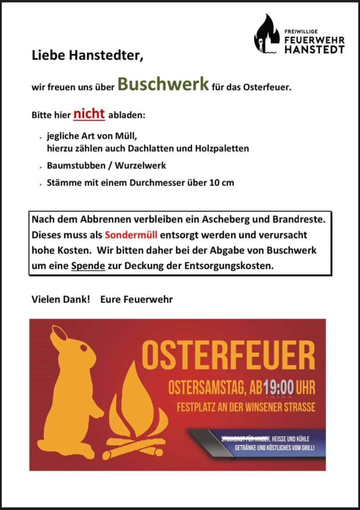 Unser Osterfeuer in Hanstedt, findet am Samstag, dem 04.04.2026 um 19 Uhr auf dem Festplatz in der Winsener Straße statt!